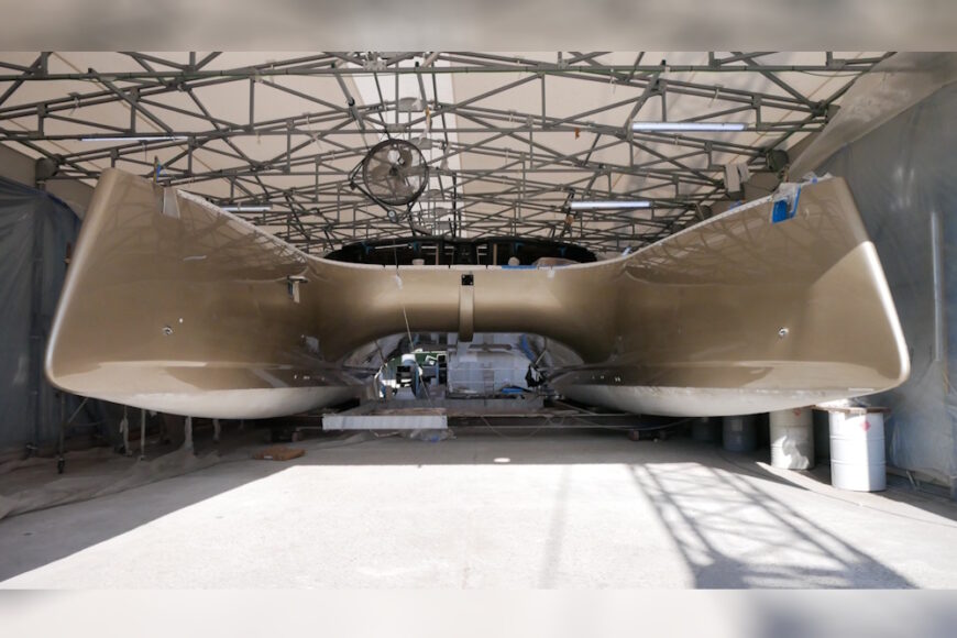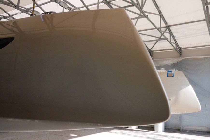 The C-Cat 65 weighs in at just 18.5 tons light displacement — lean for a 21-meter cat. The way it gets there is a story of putting carbon where it counts: