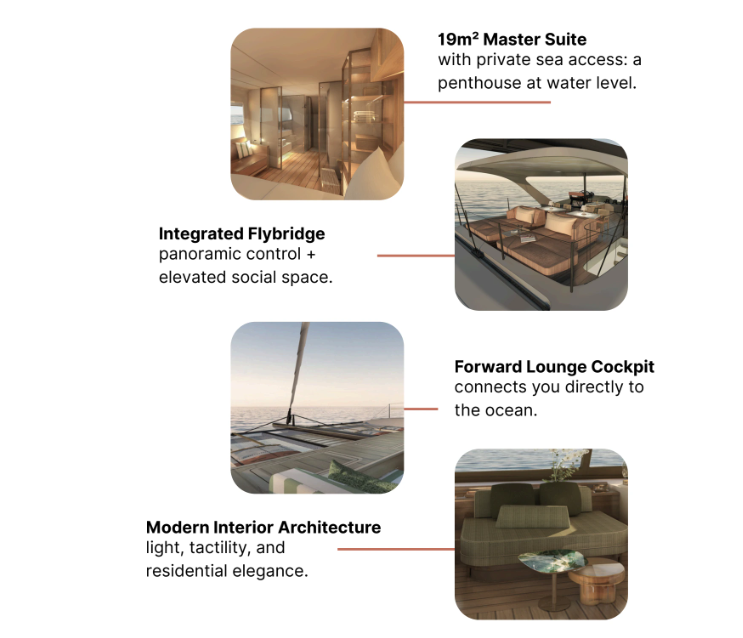 - A panoramic flybridge and forward lounge cockpit: social/relaxation are key to the experience.