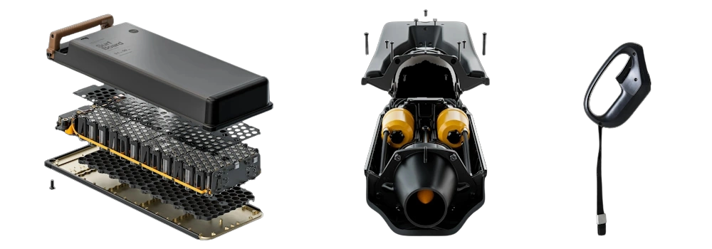 The power unit (battery and jet) fits seamlessly into the board’s frame, and is held in place by an elegantly designed locking mechanism. It is modular and tool-less, and designed for a painless setup with easy transportation and service.