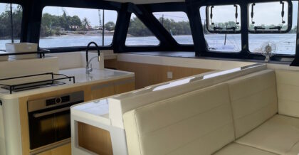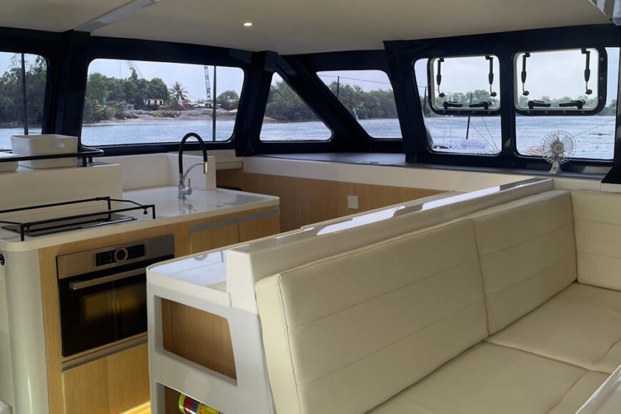 This is a catamarans that moves well through the water, so there is not as much space down below in the hulls as some of her competition, but it is still a very comfortable yacht. Up top, where you will be spending most of your time, the living room is very generous with a big social dining area, a forward facing nav station and a galley with plenty of prep space that is safe in a seaway.