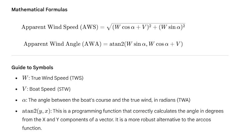 Here are the mathematical formulas used by the wind calculator, presented with a guide to the symbols. These equations are a direct representation of the vector calculations performed in the code.