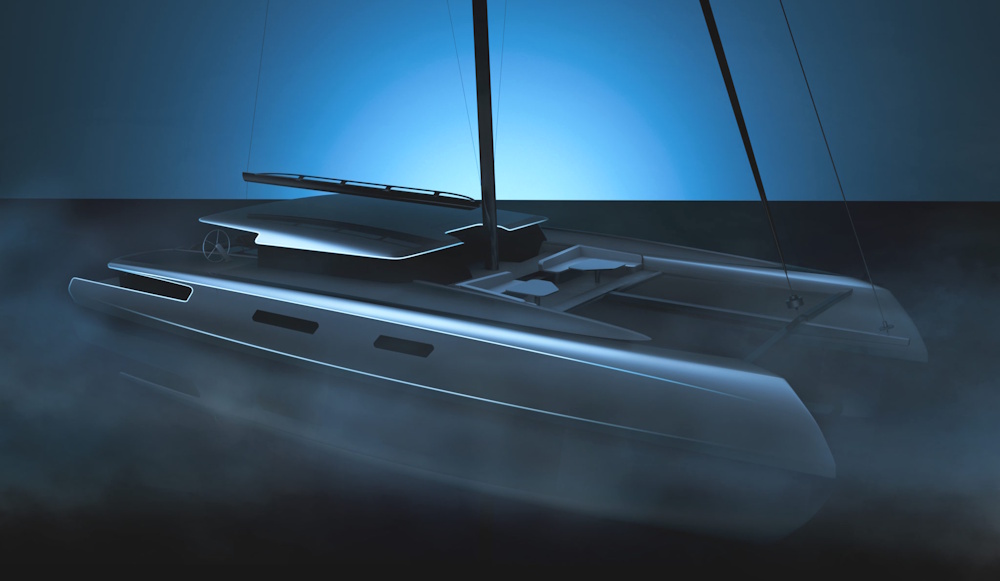 This carbon-built catamaran will be over 30 meters in length, a striking design with sharply inverted bows.